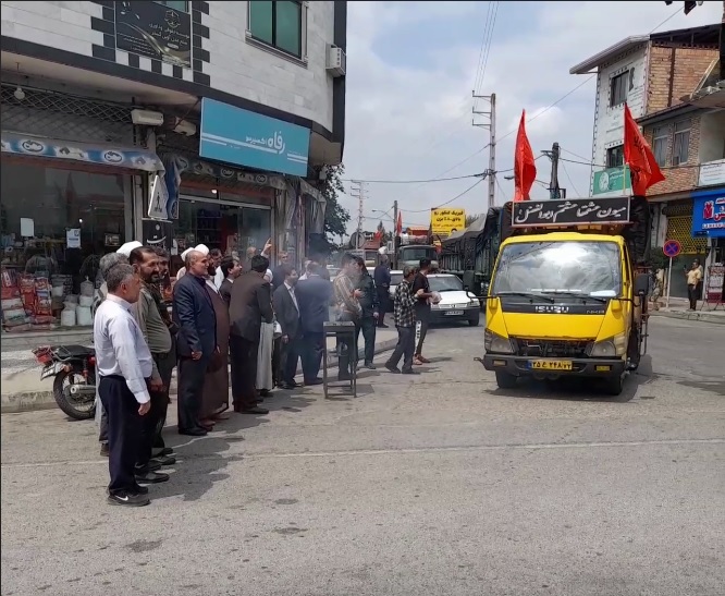 بدرقه امام جمعه بخش بابلکنار حجتالاسلام والمسلمین رزاقی از خادمان موکب بخش بابلکنار جهت اعزام بسمت کربلایی معلی